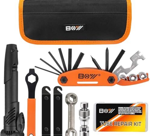 - 【Bike Repair Kit】- Bike tool kit includes 1pcs mini tire pump with extra valve, 1pcs 16-in-1 bike multitool, 1pcs 4mm allen wrench, 1pcs 5mm allen wrench, 2pcs tire levers, 1pcs polish metal, 6pcs patches with plastic box and 1pcs bike bag. This kit...