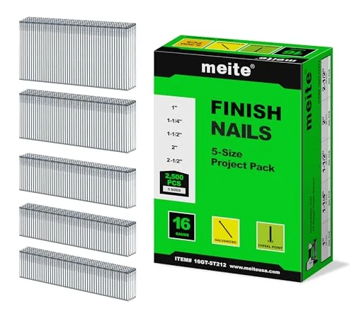 - Bright Galvanized & Non-Jam Coating: meite 16 gauge finish nails have been passed salt-spray, galvanized finish for no-rust and corrosion-proof, ideal for indoor or outdoor, install window casing, chair rail or outdoor trim confidently, even in humid...