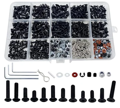 - MEGA 1020-PIECE UNIVERSAL RC REPAIR KIT - This comprehensive assortment includes essential M3 & M4 screws (flat & round head), lock nuts, flat washers, body clips, E-clips, pins, and O-rings to fix virtually any hardware issue on your RC vehicle