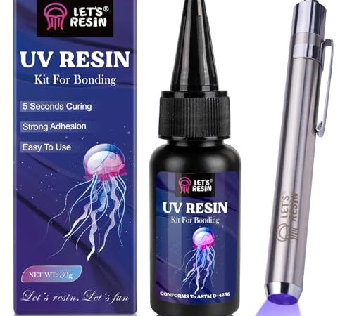 Search on AmazonLET'S RESIN UV Resin Kit with Light, Bonding&Curing in Seconds, 30g UV Resin with Flashlight for Welding, Jewelry UV Glue Adhesive for Plastic Repair, Glass Light, Craft Decor